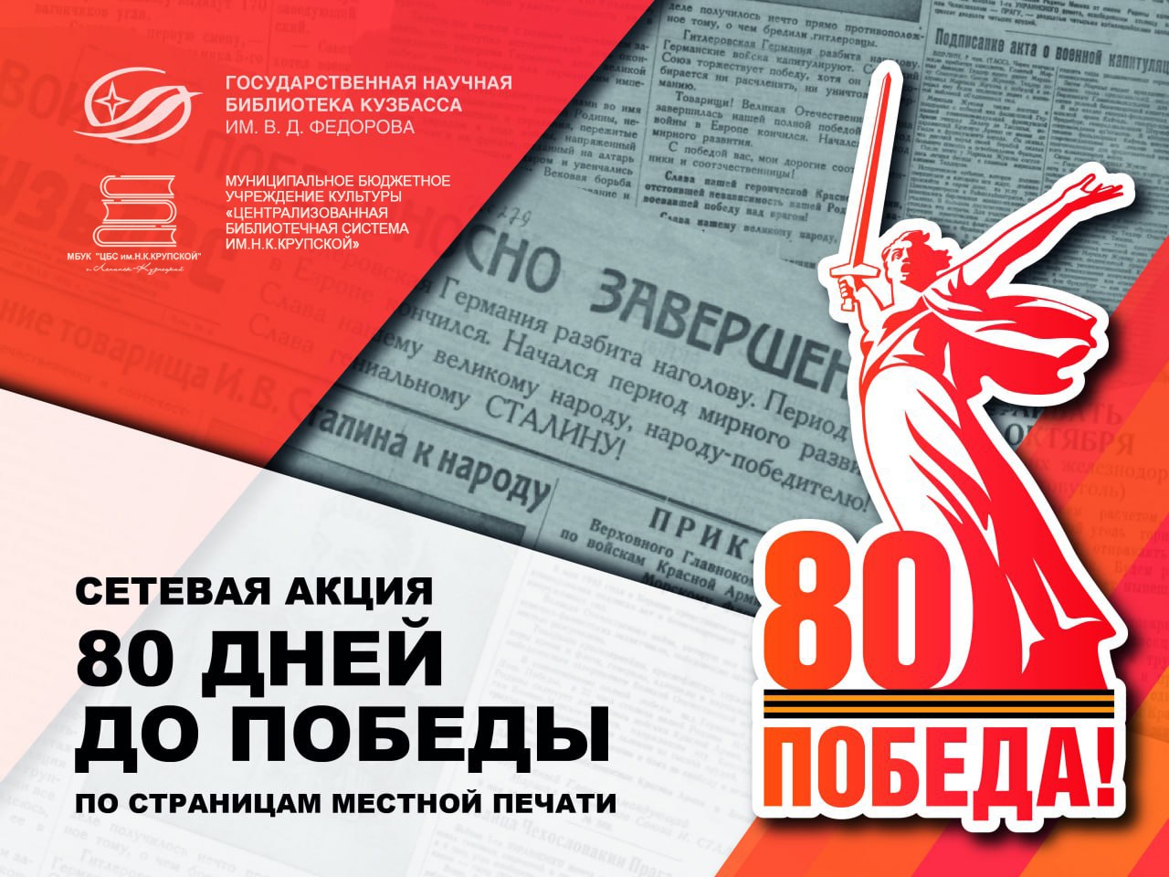 19 февраля стартовала сетевая просветительская акция библиотек Кузбасса «80 дней до Победы. По страницам местной печати» . Местные газеты региона за 1941–1945 гг., в которых писали о событиях на фронте, рассказывали о трудовых подвигах и тыловой жизни, отражают дух военного времени. Акция направлена на обнародование значимых фактов о роли Кузбасса в Великой Отечественной войне, на демонстрацию современникам страниц городских и районных газет военной поры, которыми зачитывались жители Кузбасса – настоящего фронта в глубоком тылу, начиная с июня 1941 года и первых военных вестей и до победного мая 1945 года, когда пресса сообщала, что все достижения и рекорды обычных людей в промышленности, сельском хозяйстве, медицине, образовании и культуре помогли одержать Великую Победу над фашизмом.