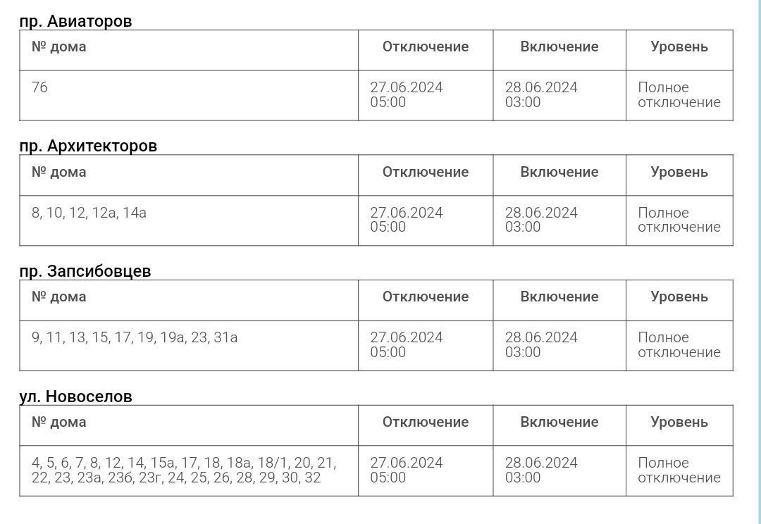 ООО «Водоканал» информирует жителей о полном отключении холодного водоснабжения 27.06.2024 с 5:00 до 3:00 28.06.2024 г. Отключение буудет произведено по следующим адресам: