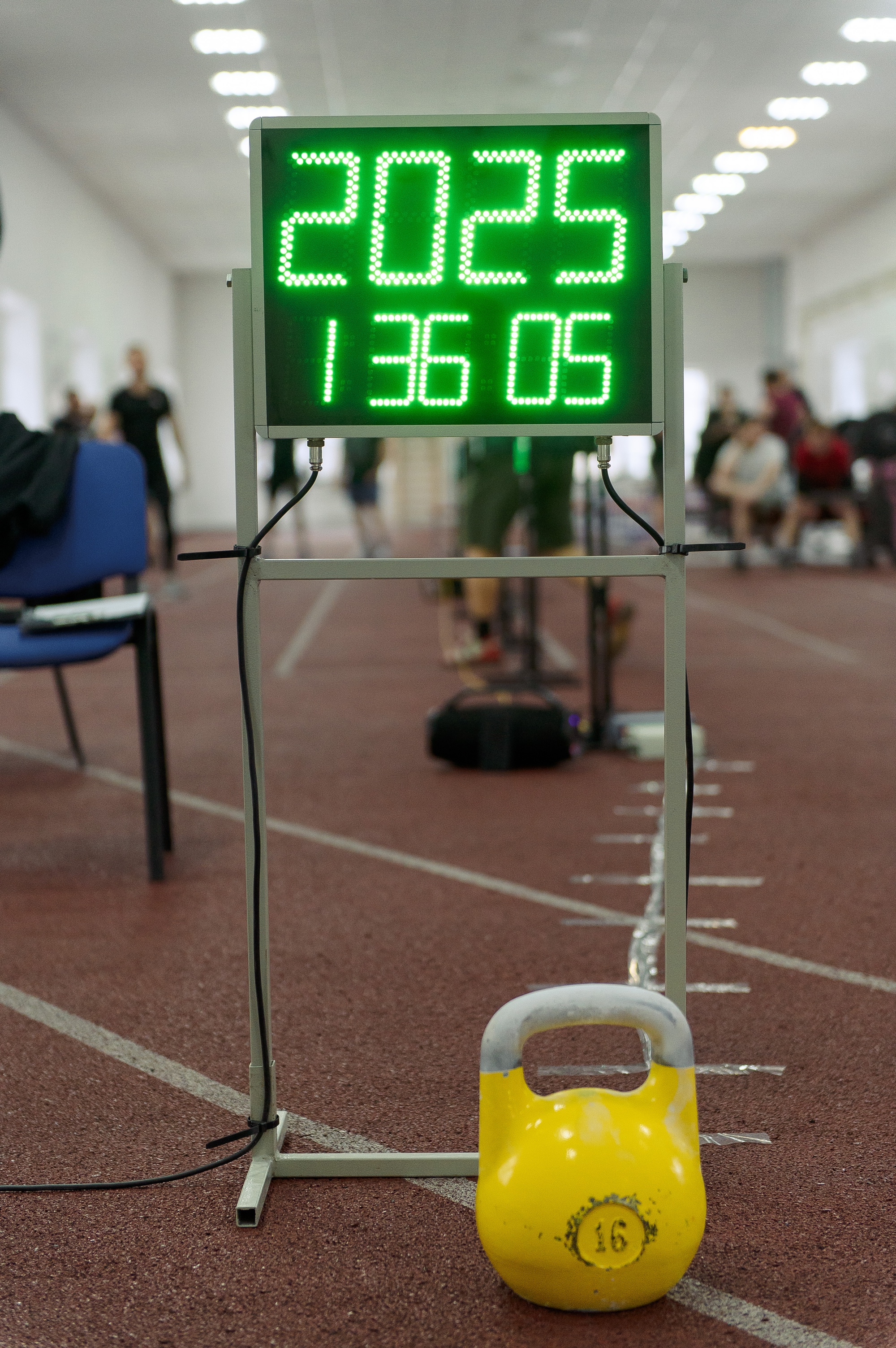 Гиревики на семи помостах поднимали гири весом от 8 до 24 кг. Общая сумма подъемов составила 2025 раз.