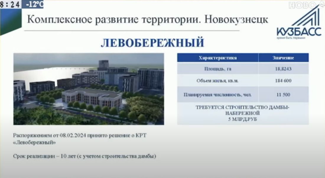 «Прошёл конкурс по Левобережному участку КРТ, - сообщил мэр. – У нас есть компания, которая заключает договор комплексного развития территории. Эта компания называется «Семейный парк». Это специализированный застройщик, который строит подобные кварталы в Томске и Новосибирске, а сейчас и в Кемерове, и в Новокузнецке.