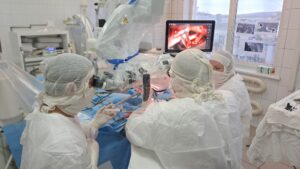 В нейрохирургическом отделении теперь есть современный высокотехнологичный микроскоп, который во время операции выдает на большой внешний монитор качественное изображение с увеличением до 24-х раз и позволяет врачам увидеть мельчайшие сосуды. Его приобрели за 25 миллионов рублей по федеральному проекту «Борьба с сердечно-сосудистыми заболеваниями» национального проекта «Здравоохранение».
